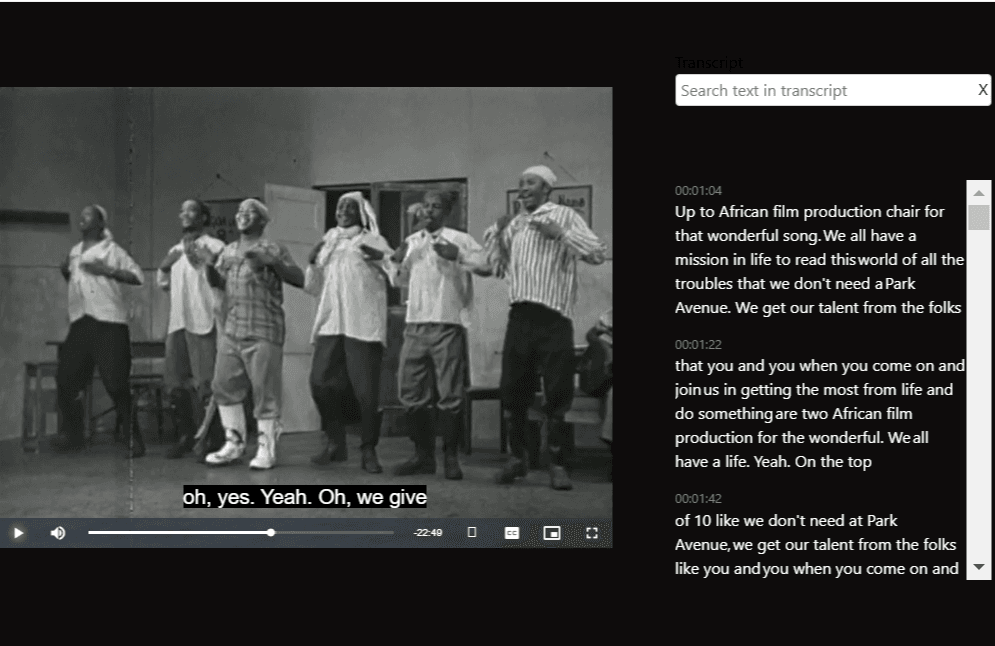 The films are delivered on the Africa Commons platform, transcribed and keyword searchable for the first time. Search for words or a phrase, and the transcript jumps to the matching text. Click into the transcript, and the film moves to that location.