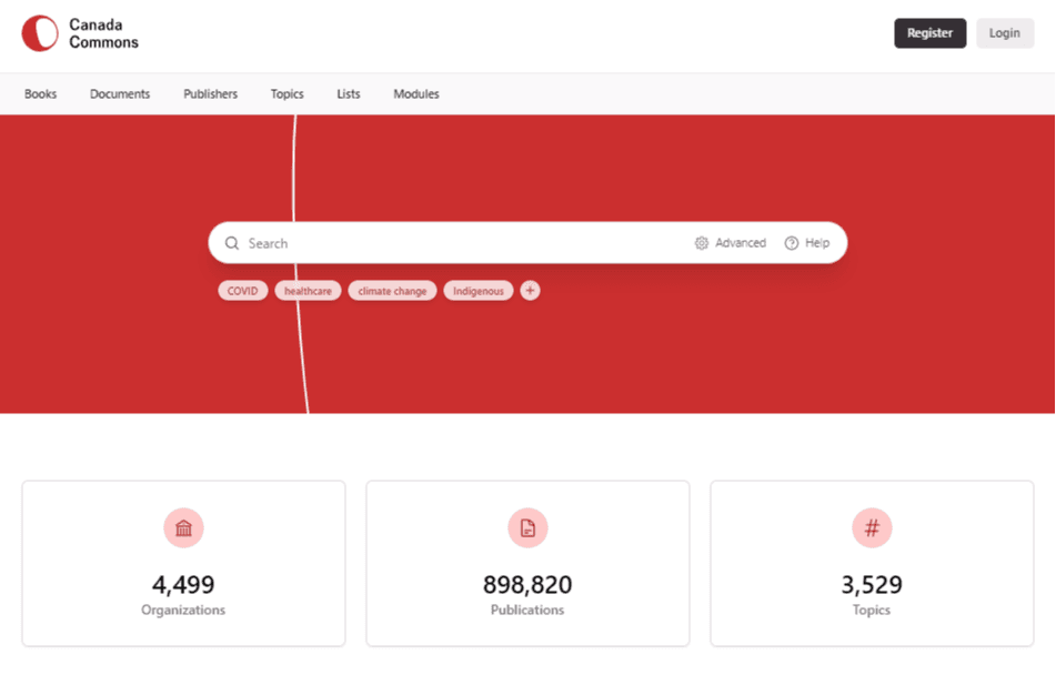 Created in partnership with Trojman Corporation in Toronto, Canada Commons comprises one million books, government documents, think tank publications, and primary sources from almost 5,000 Canadian organizations.