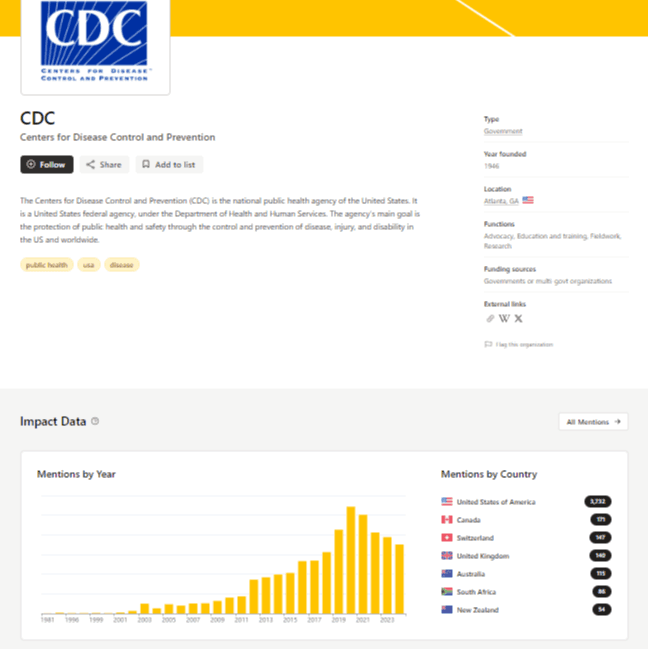 On your organization's page, you’ll see a section called "Impact Data." It displays your total number of mentions by year. It also shows the top seven countries in which most mentions have been found. The “All Mentions” button invites you to explore further.